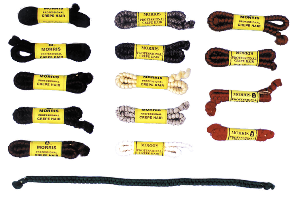 Used in the theatre for hair, beards, mustaches, etc. It comes in braids and after it is pulled apart it is glued to the face with spirit gum. Sold in 1 foot length.