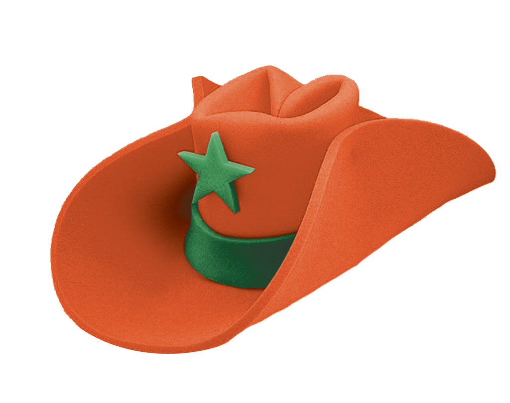 Foam rubber 40 gallon size hat with contrasting star and band. One size fits most. Brim measures 7 1/2 inches front and 1/2 inch side. Height 11 inches. Hat will need steaming and shaping to look its best.