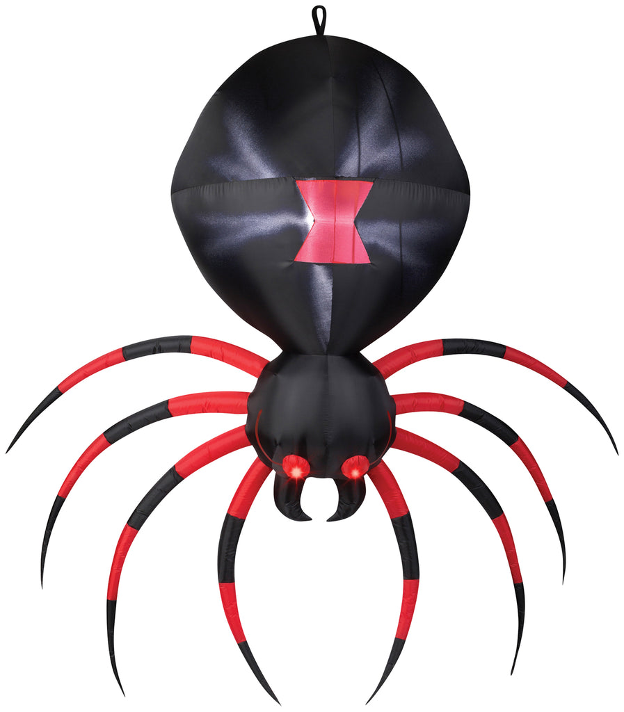 One of the most striking inflatable props you can get for your home this Halloween! Imagaine the stares and the fear on the faces of your neighbors and friends when they see this gigantic spider hanging from your home! Gigantic black spider with red eyes, and alternating black and red coloring on the spider's legs, red marking on spider's back, legs outstretched to make it seem as if she's reaching for you. Batteries not required, item uses electricity exclusively. Item measures 83 inches by 82 inches by 25 inches.