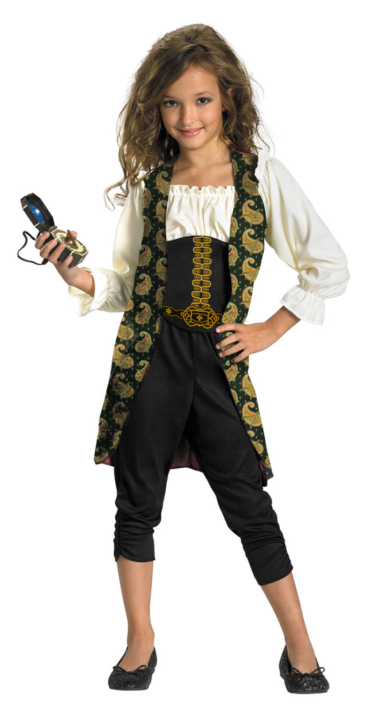This Blackbeard beauty is a dangerous pirate princess. Become Jack Sparrows rival in this Pirates of the Caribbean 4 Angelica Child Costume! Our costume comes with a billowy pirate shirt with front decorative embellishments! An attached decorative vest with comfortable black pants! Compass not included. Fits children sizes S (4-6).