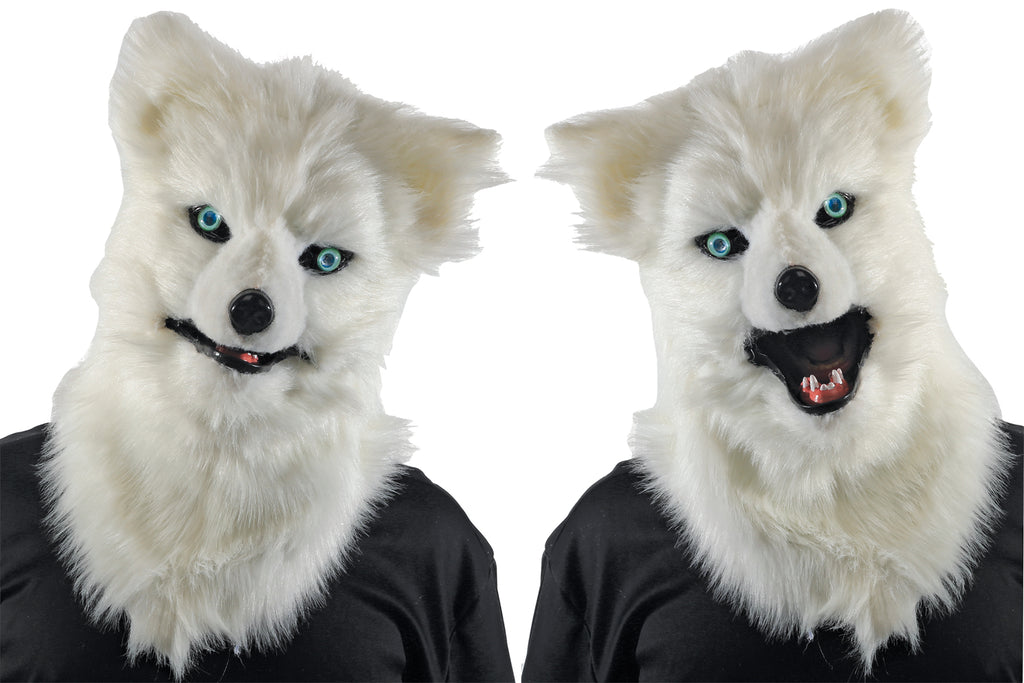 Legends come to life with this illusive white wolf animated mask with sound effects! The mouth moves when you move your mouth creating the illusion of a real wolf! White wolf mask is made from molded plastic and covered in plush white fur with intense light blue eyes. This Halloween mask is lightweight, comfortable and easy to wear. Adjustable foam inserts enable a snug fit at the jaw for realistic movement. Comes with push-button activated loud snarling, growling, and howling sounds that you operate by a push button device you hold in your hand (a cord runs down your sleeve). Creates an authentically terrifying and realistic wolf effect!
