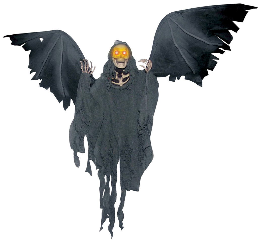 Plastic skeletal parts(arms are posable) with rotted, shredded look rags attached with large spread posable wings that move up and as though they were flapping, makes scary sounds and light up eyes. 38 inches tall and 52 inch wing span. Requires 3 AA batteries,not included. Prop is sound activated. Care and battery instructions included.