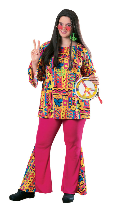 A colorful 60's blouse with matching bell bottom pants. A perfect party costume. Who says the 60's are ancient history?! Plus size. Polyester. Jewelry not included. Adult sizes 16-20.