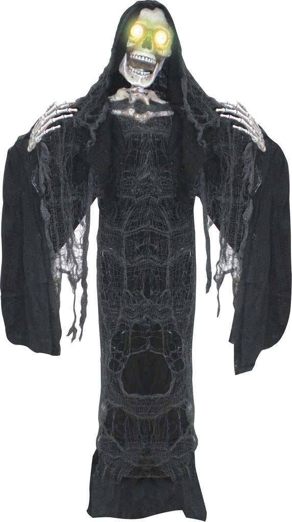 Plastic skeleton head has light-up eyes and moving mouth, skeleton hands with poseable arms, and a long gauzy gown that will move with any passing breeze. He speaks Halloween phrases, which are sound activated. Requires 3 AAA batteries, not included. 60 inches tall."There is something spooky out tonight and I think it's you." "You come for a treat or for a trick?" "Ahhh, yet another creature of the night approaches."
