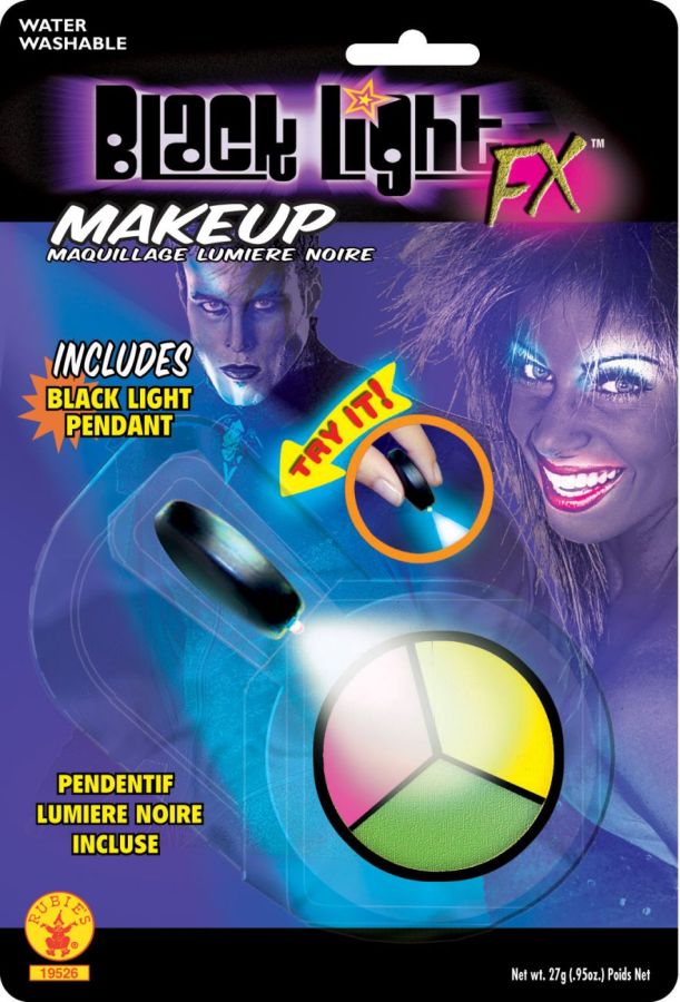 Triclor cup with glow black light makeup. Full color blister pack with black light pendant attached so your patrons can see the makeup glow. Water washable. Green/Red/Yellow