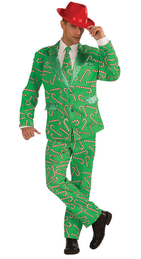 Catch every eye when you walk into your next Christmas party! Green jacket with colorful candy cane print comes with matching tie and pants. Add your own shirt! Hat and cane are not included. Men's standard fits up to size 42.