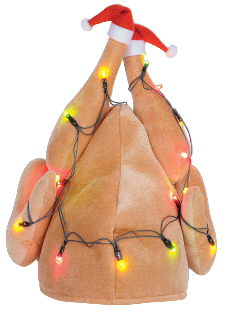 Great for Christmas and even Thanksgiving, this festive turkey-shaped headwear with Christmas lights draped over it and little Santa hats on the drumsticks will make you the topic of conversation at any holiday party. Requires 3 AA batteries not included. Plush. One size fits most.