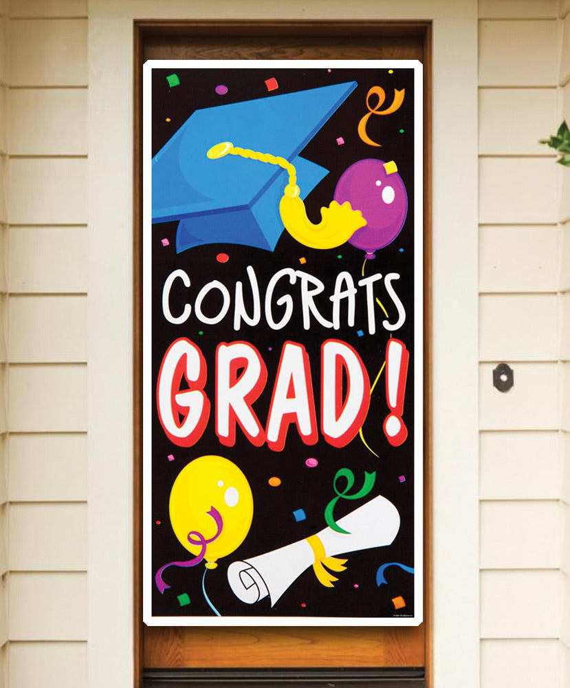 This festive, colorful door cover is perfect for greeting your favorite graduate after their ceremony! This durable 30 X 60 inch polyethylene sheet covers most standard sized doors. Image of a cap, balloons, confetti, a diploma and the words "Congrats Grad" on a black background with white boarder. For indoor or outdoor use. Attach as desired.