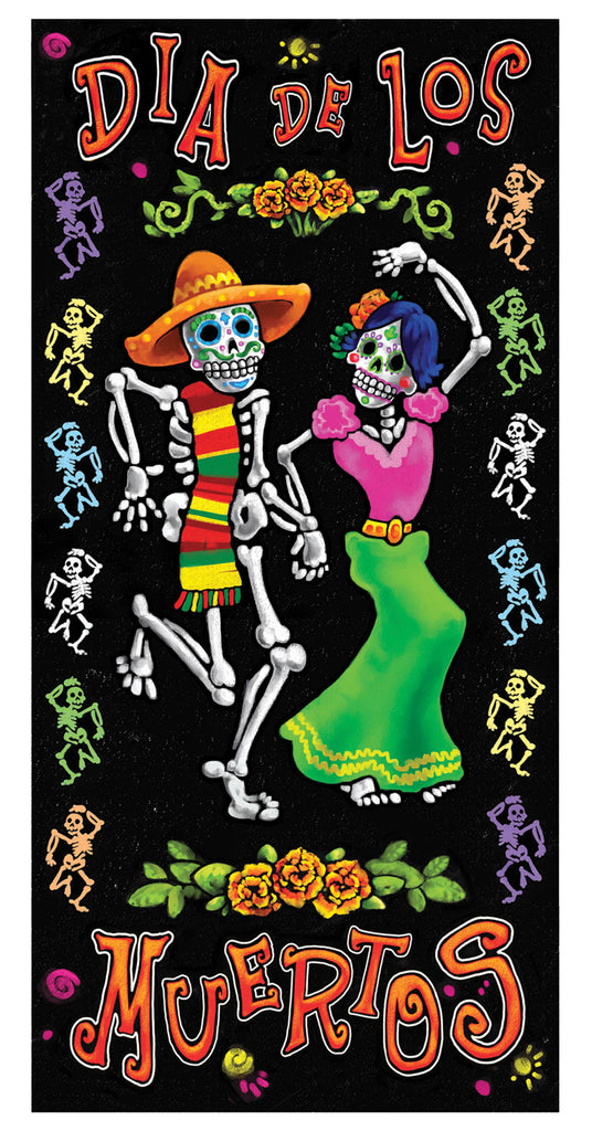 A festive door cover with a colorful design featuring two dancing skeletons celebrating the Day of the Dead! Perfect for the front door of your house so people know where the party is! Polyethylene. 30in x 5ft. Great for indoor and outdoor use.