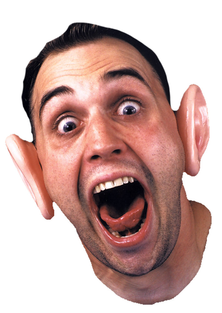 Giant vinyl ears that fit easily over your own ears. Measures 5 1/2 inches tall, about 4 inches wide. Contains 2 ears!