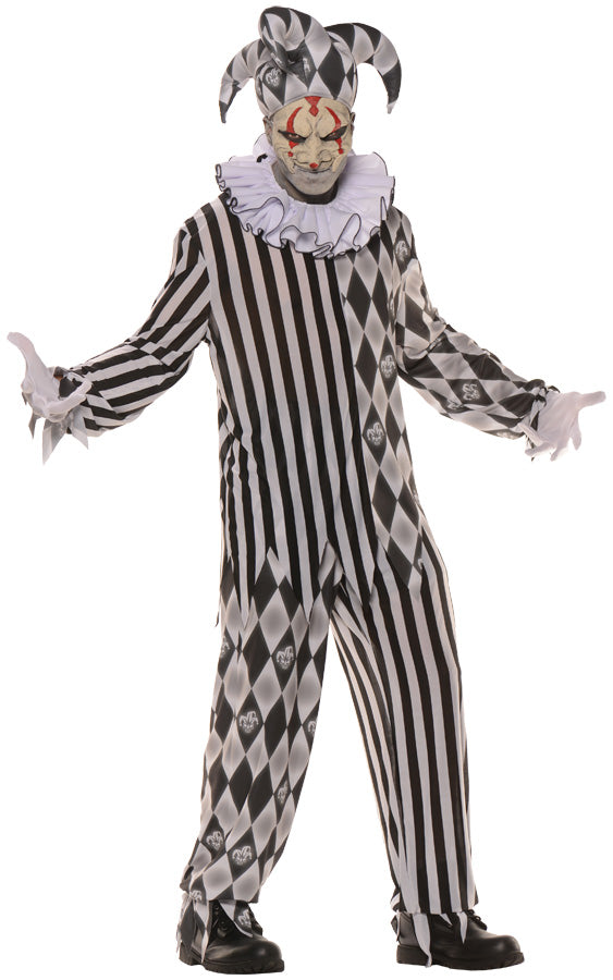 Be careful...this clown isn't clowning around! watch your back. Perfect for adding a sinister edge to medieval events. Two tone, printed tunic with ragged cuffs, pants with ragged cuffs, collar and hat. One size fits most adults. Fits waist size 34"-38" and chest size 42"-46". Polyester.