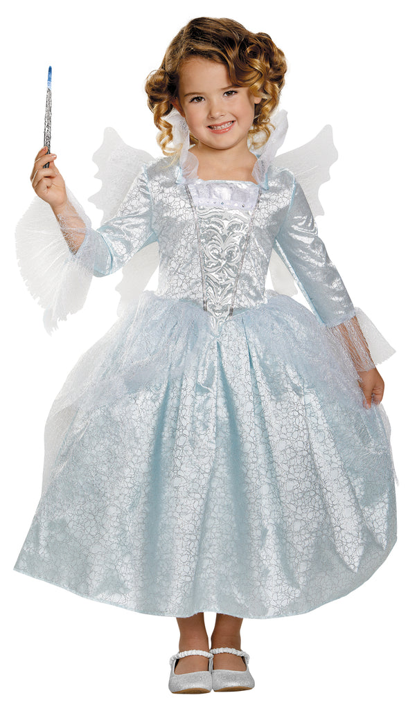From the fabulous new Disney Cinderella movie! Deluxe white satiny glitter-patterned dress has a sheer sparkle stand-up collar, sheer sparkle lower sleeves and a full ankle-length skirt with sheer sparkle side drapes. Includes detachable sheer glittery wings! Child large fits sizes 10-12.