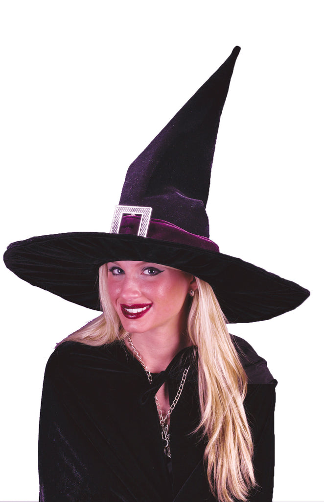 The ultimate witch hat. 17 inches high and 19 inches in diameter with silver buckle hat band. One size fits most adults. Black velour with non-removable purple band.
