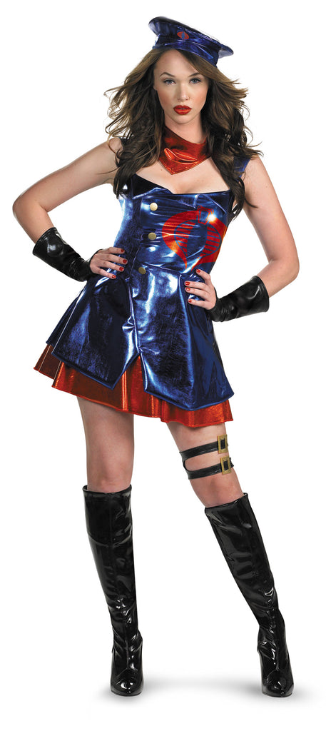 Shiny blue dress with red COBRA insignia on bodice, shiny red petticoat, black glovettes, black garter, red scarf and matching blue hat with red COBRA insignia. Boots not included. Womens' sizes 8-10.