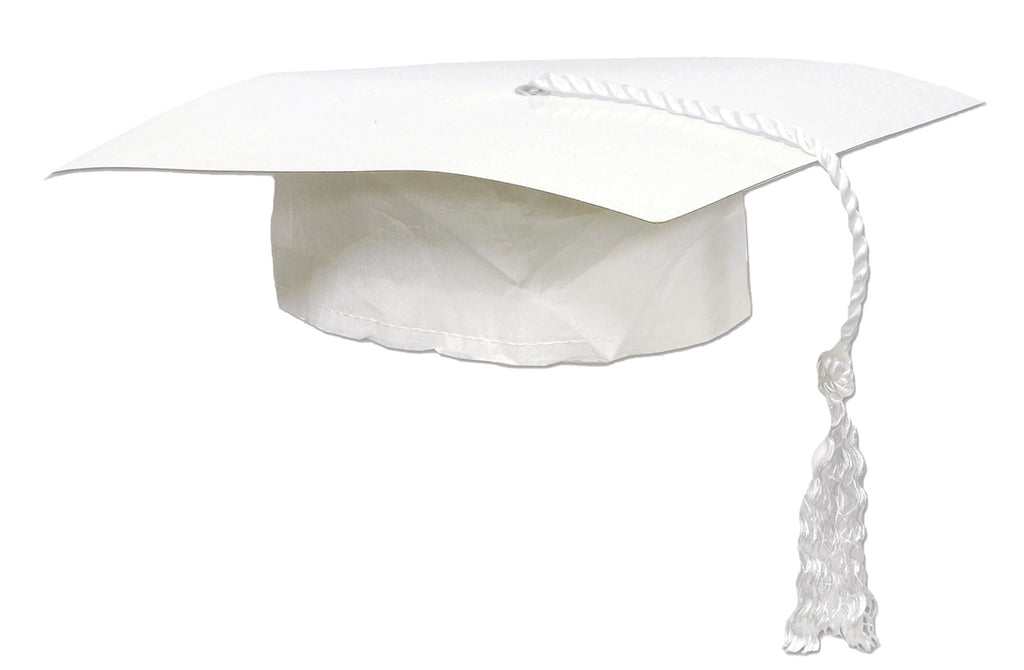 A very sharp-looking graduate cap that would work for any type of graduation ceremony, whether it be a church or a school. Simple and elegant. Paperboard/Crepe. 9 1/4in board. One size fits most. White.