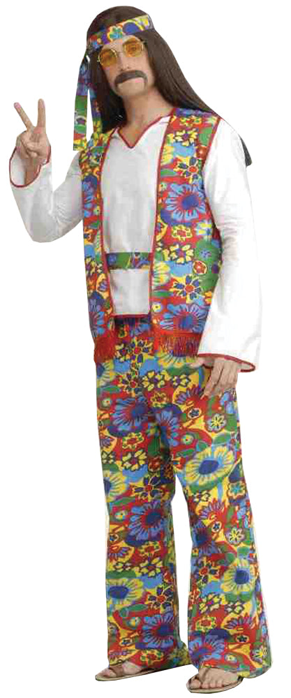 Take a step back in time to an era of peace and love. Headband, vest, shirt, belt and pants. One size fits most adults up to size 48. The maximum waist size of the pants is 50 inches.