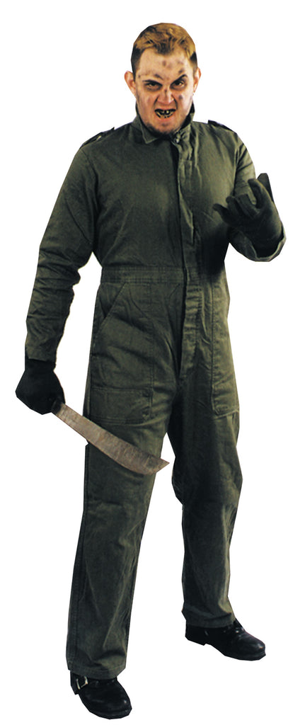 Dark green jumpsuit with zipper front. Slight imperfections add to the scary appearance. Great when paired with a horror mask and creepy knife or axe! Adult standard fits up to size 48.