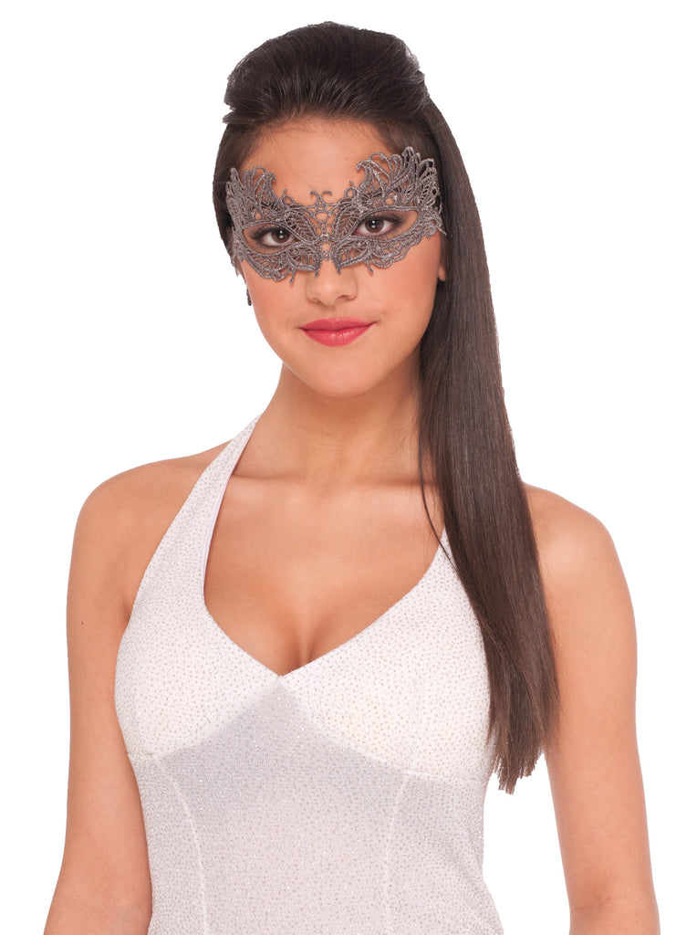 This very beautiful, delicate-looking lace eye mask with ribbon ties is great for any masquerade event, including Mardi Gras! Crafted with shimmer lace. Very elegant! One size fits all. Dark gray.