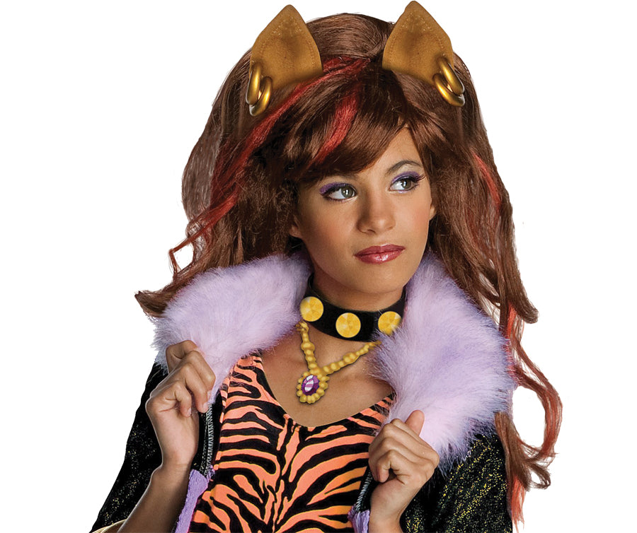 Great accessory for your Monster High Clawdeen Wolf costume! Wig is dark brown hair with auburn highlights and tan wolf ears with gold earrings attached to the top. One size fits most children. 100% synthetic fibers.