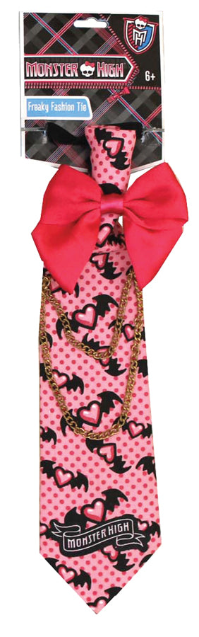 Your child can look like their fave Monster High character with this sharp-looking poly-cotton clip-on tie with red dots on pink background with hearts with wings printed on top. Tie also has pink attached bowtie and chain on front. One size fits most children. Monster High insignia on bottom of tie.