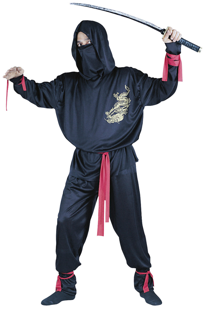 Hooded shirt with printed gold dragon, fabric veil mask, pants with elastic waist, extra long red sash, ankle and wrist ties. Sword (BF60) only sold separately. One size fits most adults.