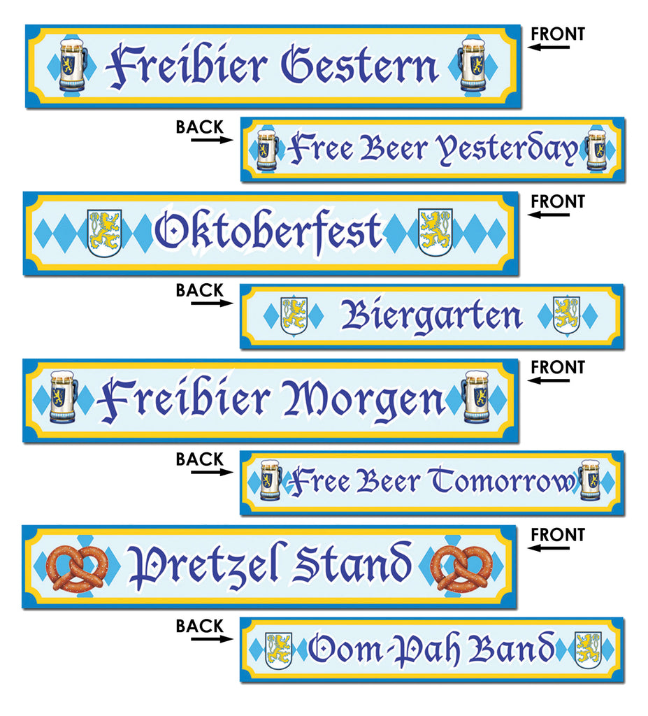 Great signs for your Oktoberfest celebration! Comes with 4 signs, each with a different saying on the front and back for a total of 8 designs, 2 for each sign. Paperboard. 4in x 24in.