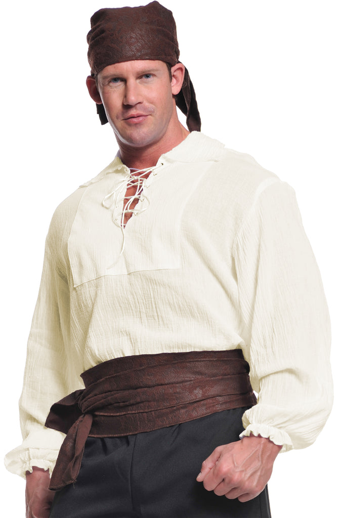Perfect for the plundering pirate! Cream long-sleeved shirt with a lace-up front and gathering at the wrists. Adult one size fits sizes 42-46. 100% POLYESTER