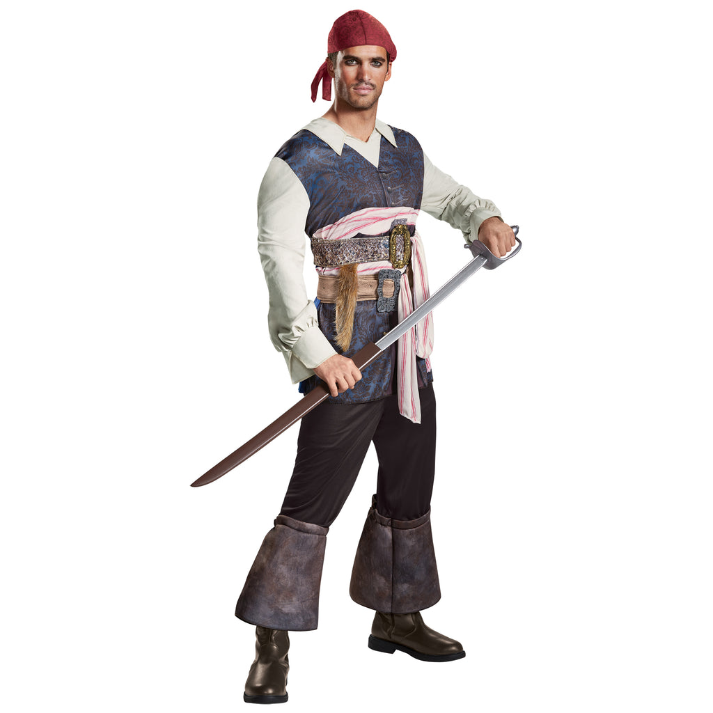 Be the life of the party when you become the lookalike to Captain Jack Sparrow as the character appears in the blockbuster movie Pirates of the Caribbean: Dead Men Tell No Tales. The costume includes tunic with attached faux fur tail and sash, two belts with attached buckles, pants with attached boot tops and bandana. Costume fits adult sizes 42-46.