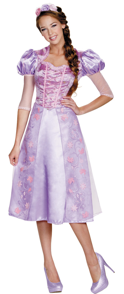 Rapunzel Deluxe Adult is a lovely storybook purple dress with a lace-up look bodice and a skirt with pink and purple flower print sheer overlay with satin underskirt. Below-the-knee hemline.