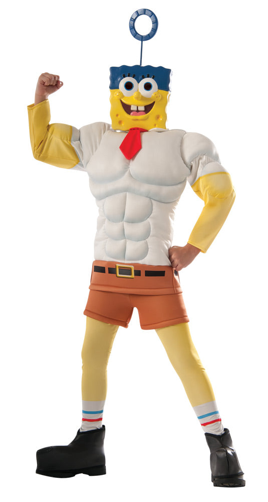 Great Deluxe Invincibubble Spongebob Muscle costume! Padded muscle chest shirt comes with pants which look like tights and shorts, shoe covers, and character mask. Small fits children sizes 4-6.