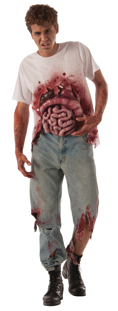 Go for gruesome with this simple costume! Bloody t-shirt comes with strap-on guts. Just add your own distressed jeans and boots for a shocking look! Men's standard fits up to size 42.