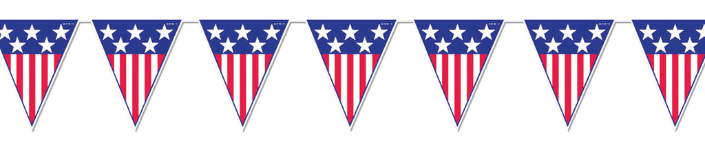 Get into the spirt with our Spirit of America Pennant Banner! This American flag themed, all-weather banner measures 10in. x 12ft. Polyethylene. 12 pennants/string. Indoor/Outdoor. Just the decoration you need for July 4th, parties, plays, and other patriotic fun productions and festivities!