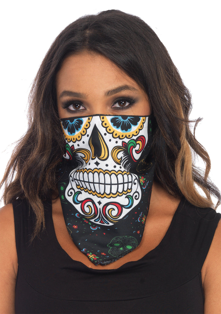 No time for makeup? Throw on this sugar skull bandana and you have an adorable Day of the Dead look in minutes! Black print with white elaborately decorated print skull. One size fits most.