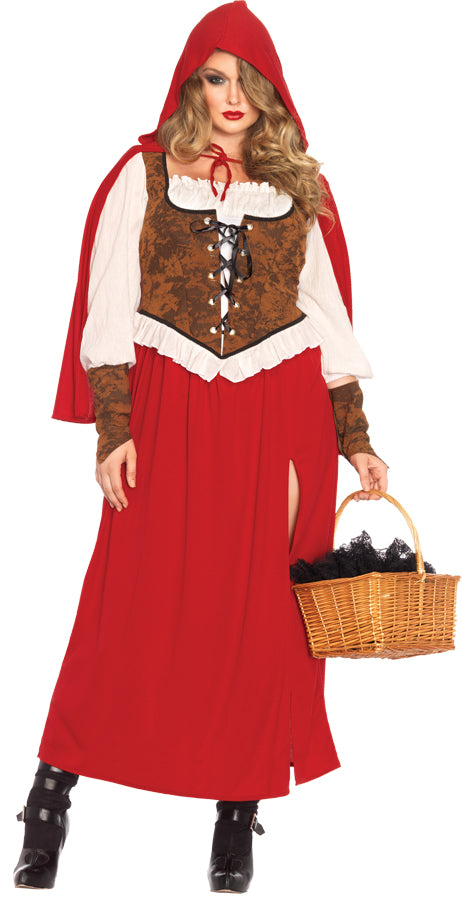 High slit dress,wrist cuffs,hooded cape. Red color scheme. Fits adult women's sizes 22-26.