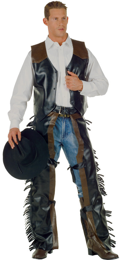 Look right at home out on the range, roping cattle, and doing anything else an authentic cowboy does in this great costume. Perfect for any Western-themed event or party. Brown leather-look chaps and vest with black leather-look area on vest and the same on chaps plus fringe. Fits adult XXL size. Waist 42" and chest 48"-50". Hat not included.