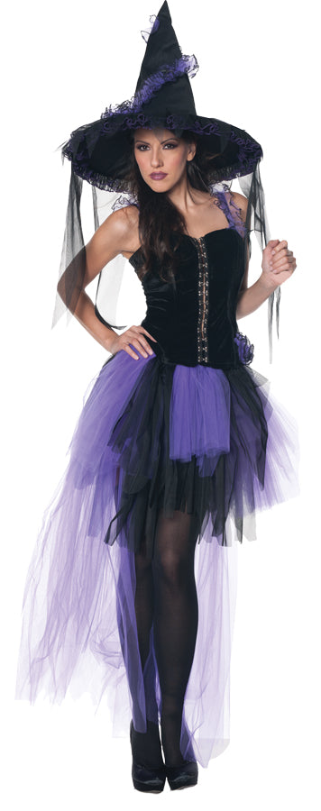 You'll be sure to cast a wicked spell when wearing this sexy witch costume. Velvet bustier top, tutu with attached train, and tattered ribbon hat. Shoes and broom not included. Fits adult womens medium sizes 8-10.