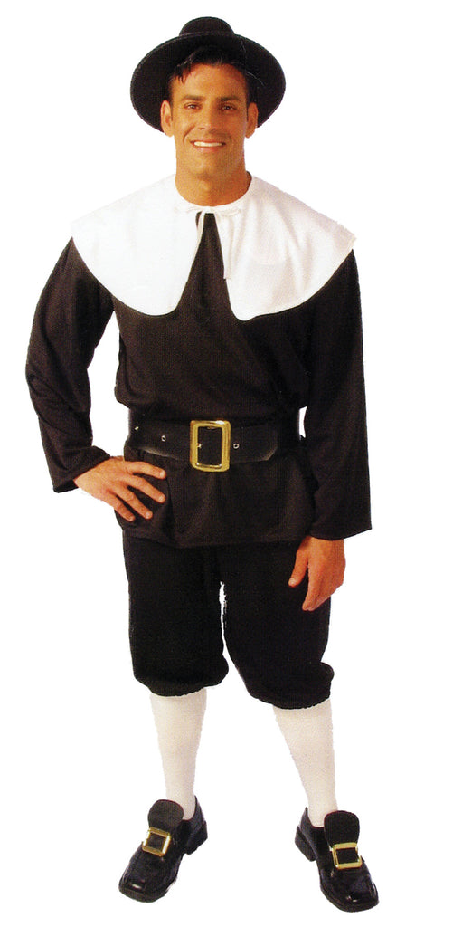The perfect costume for harvest season. Black pullover shirt with tie closure at back neck, and elastic waist knickers. Belt and white tie-on collar included. 100% polyester. Fits most men with 46 to 48 inch chest size. Add your own hat (FM59987), shoe buckles (BB221), and sock (BB156); sold separately. Care instructions - hand wash cold, line dry-stretch trim.