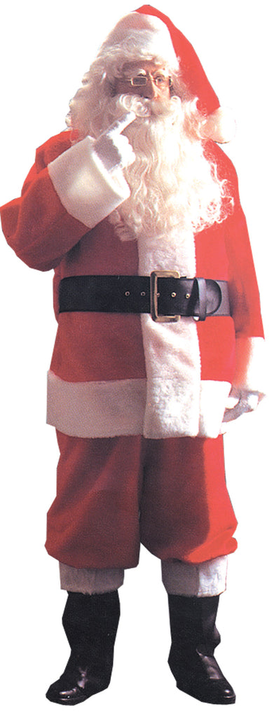 Red plush faux fur coat and hat with thick white plush trim, matching red elastic waist pants, white knit gloves, and black vinyl belt and boot tops with white plush trim. Unlined coat features zipper front closure. Fits most men sizes 42 to 48. Wig and beard not included. 100% acrylic face, 100% olefin back.